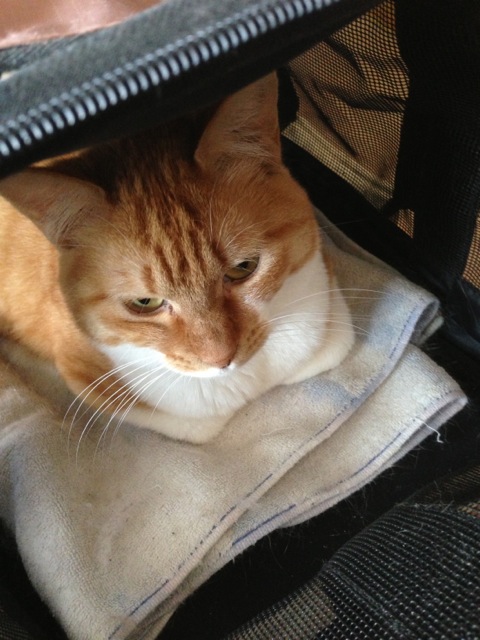 ストラップをたすき掛けにしてバッグを背負って、自転車で獣医さんへ。往復ずっとにゃーにゃーないていた。
