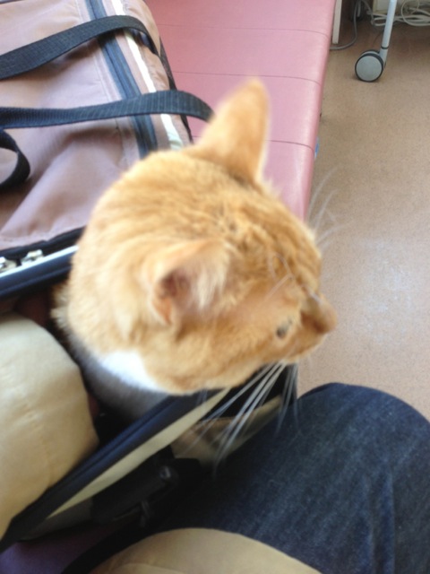 病院について、順番を待っている間は、ファスナーを少し開けて、撫でてあげて落ち着かせたら、なくこともなく静かになった。けれど、頭を出してキョロキョロしていたよ。ここはどこ?って感じで。