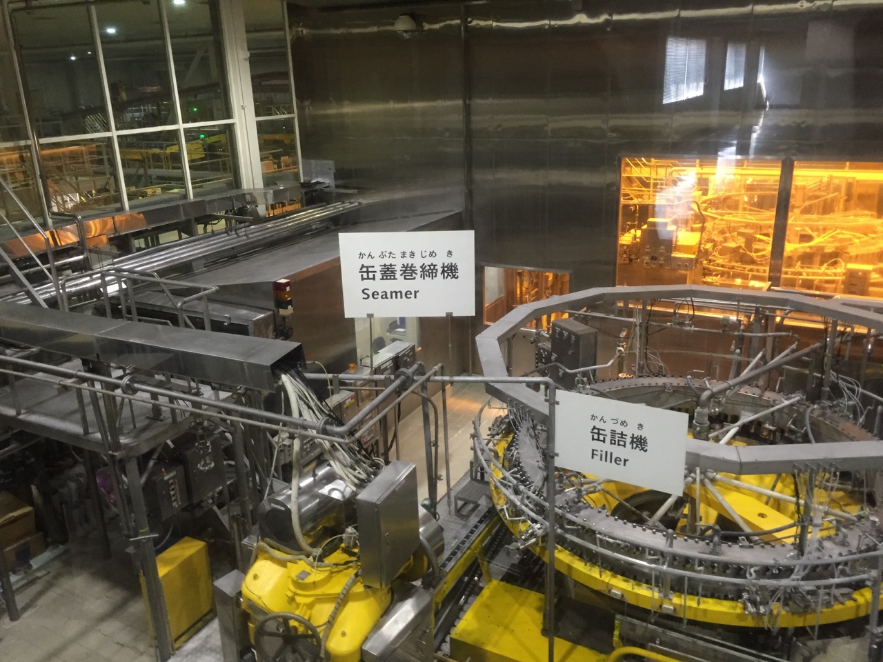 工場内見学は、工程順に、原料、仕込み、発酵、貯酒、ろ過、缶詰のコーナーに分かれている。