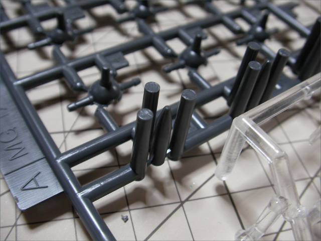 が、これは、弾頭パーツを保護するもの。これがないと、パーツが他のランナー部品と接触して、一番弱いゲート部分に負荷がかかり、ねじれたり切れたりしてパーツが痛む恐れが多分にある。